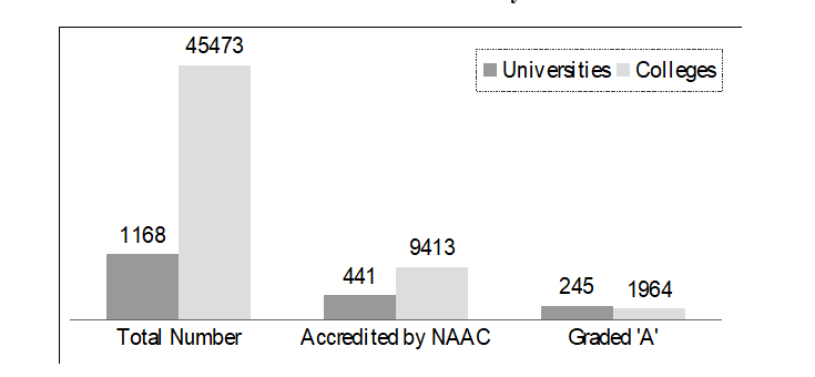 As of August 2023, only 441 universities and 9,413 colleges were NAAC-accredited, with just 245 universities and 1,964 colleges earning an A grade.[64] According to AISHE 2021–22, India had 1,168 universities and 45,473 colleges in 2021–22. It is likely that colleges and universities not accredited by NAAC are below average, which is why they have avoided accreditation. This means: