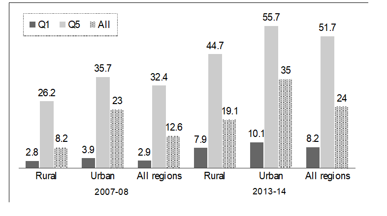 Over the six-year period 2007–08 to 2013–14, GAR in higher education nearly doubled from 12.6 percent to 24 percent. But as Chart 4.10 shows, these averages mask a sharp rise in inequality, both between income groups and between rural and urban areas: