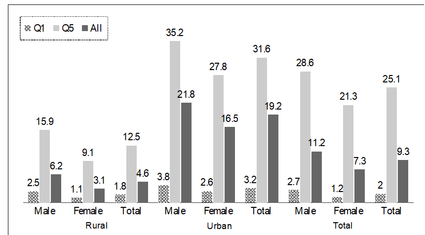 A major limitation of GER and GAR as indicators of higher education growth is that they do not account for completion—many students who enrol in college, and even attend college for a short while, often drop out before completing the course, likely due to financial constraints. The most reliable metric for assessing the status of higher education is the higher education completion rate (also called attainment rate)—the percentage of adults (above 15 years of age) who have completed at least a graduation degree. Chart 4.12 presents this data across income quintiles, rural/urban areas and gender.
