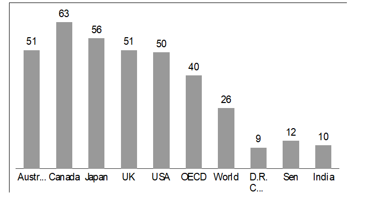Source: Data for developed countries is for 2022, from: Education At a Glance 2023: OECD Indicators, https://www.oecd.org; data for world and Sub-Saharan African countries is for 2019 and is from: Global Education Monitoring Report 2021/2: Non-State Actors in Education: Who Chooses? Who Loses?, p. 433, https://unesdoc.unesco.org. Data for India is not available in the UNESCO report, so India data is for 2013–14 from J.B.G. Tilak, cited in Chart 4.12. It must not have increased, as GAR has declined.