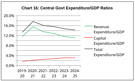 In order to achieve this reduction in overall spending, the Central government has sharply reduced what is called its ‘revenue expenditure’ as a percentage of GDP. However, it is revenue expenditure (in the form of salaries, welfare expenditures, subsidies, etc) that comes directly into people’s hands. So the reduction of revenue expenditure as a proportion of GDP further dampens overall demand in the economy.
