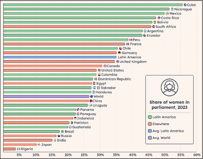 A recently published chart (below) from Latinometrics shows that Cuba, Nicaragua and Mexico are indeed the leaders in female parliamentary representation, not only regionally but globally.
