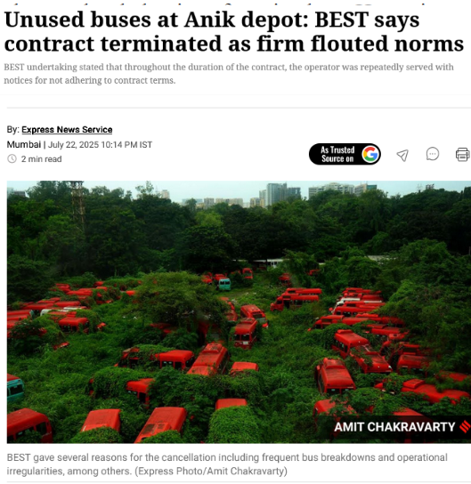 13. Express News Service, “Vegetation covers unused BEST buses at Wadala depot”, Indian Express, July 21, 2025.