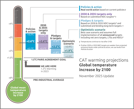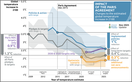 “Almost none of the 40 governments the [Climate Action Tracker] analyzes have updated their 2030 target, which is critical to keep warming levels below 1.5°C, nor have they set out the kind of action in their new 2035 targets that would change the warming outlook,” Climate Action Tracker said in its report. The chief executive officer of Climate Analytics, Bill Hare, added, “The world is running out of time to avoid a dangerous overshoot of the 1.5°C limit. Delayed action has already led to higher cumulative emissions, and new evidence suggests the climate system may be more sensitive than previously thought. Without rapid, deep emissions cuts — over 50% by 2030 — overshooting 1.5°C becomes ever more likely, with severe consequences for people and ecosystems.”