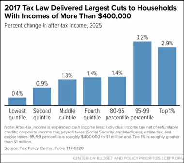 A report by the Center on Budget and Policy Priorities looked at the impact of Trump’s 2017 tax law. They found that the richest 1% of Americans had their taxes reduced by $61,090, while the poorest 20% of Americans saw their taxes cut by just $70.