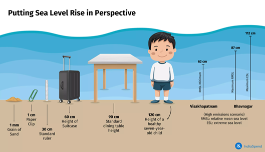 A July 2025 study by the Indian National Centre for Ocean Information Services (INCOIS), a government body, estimated that—relative to the reference period or baseline of 1995-2014—India’s coastal cities will see an increase in RMSL between 62 cm in Vishakhapatnam and 87 cm in Bhavnagar by the year 2100.