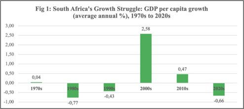 For the cast majority of South Africa’s citizens, the captured and controlled democracy did not bring much social and economic progress. This is reflected in the country’s dismal economic growth record. Fig 1 shows that per capita GDP growth has been negative for most of the decades. since the 1970s. In the country’s modern history, the 2000s until Jacob Zuma’s presidency, which started in 2009, was the golden period. And it wasn’t much of a golden period, with a paltry 2,6% annual growth on average.