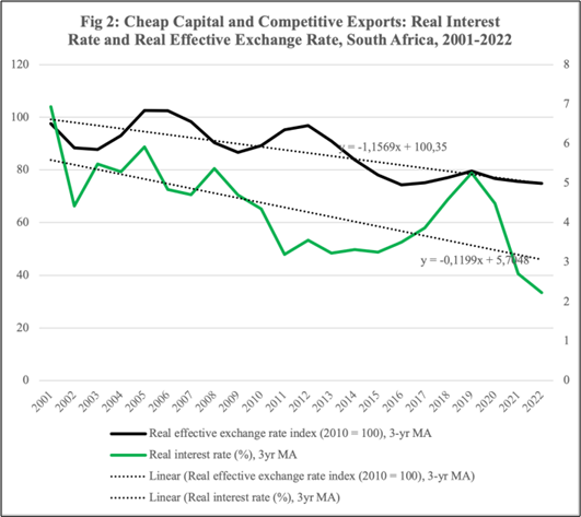 In fact, intensifying capital deepening through mechanisation and other tools that reduce the labour share has been facilitated by low and declining real interest rates in South Africa. At the same time as the decline in real interest rates, the Rand Exchange rate significantly depreciated against the dollar and other hard currencies. Fig 2 below shows these two trends over the past decades: