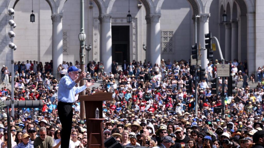 “Your presence here today is making Donald Trump and Elon Musk very nervous,” Sen. Bernie Sanders told Angelenos on April 12 as he took the stage to a thunderous ovation at Gloria Molina Grand Park in Downtown L.A. “There are some 36,000 of you – the biggest rally yet,” stated the Independent socialist from Vermont who, along with Rep. Alexandria Ocasio-Cortez, is spearheading the “Fight The Oligarchy” national tour to mobilize the masses to resist the Trump-Musk regime.