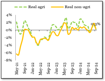 Well before the Covid lockdown, non-durables production was already slowing down. During the Covid period, expectedly, production fell outright; it then recovered after the lockdown ended. However, in the recent period, production appears to be falling outright again. The chiefs of major fast-moving consumer goods (FMCG) firms have been widely quoted in the media bemoaning the lack of demand.
