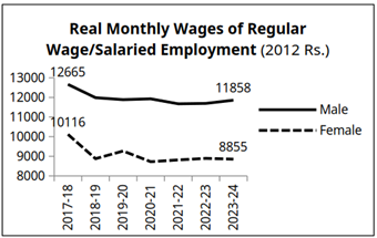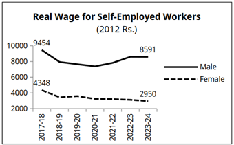 (3) In the period since 2017-18, the real wages of salaried/regular workers have fallen by 6 per cent for men, and 13 per cent for women. Wages are expressed in 2012 rupee terms in the Chart below.
