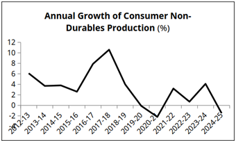 All these developments have resulted in the depression of demand for ordinary goods of mass consumption. This can be seen in the Index of Industrial Production (IIP) data. The growth of consumer non-durables – largely items of daily use such as soap, detergent, toothpaste, tea powder, food products, medicines, paper, and so on, has been trending downward for some years.