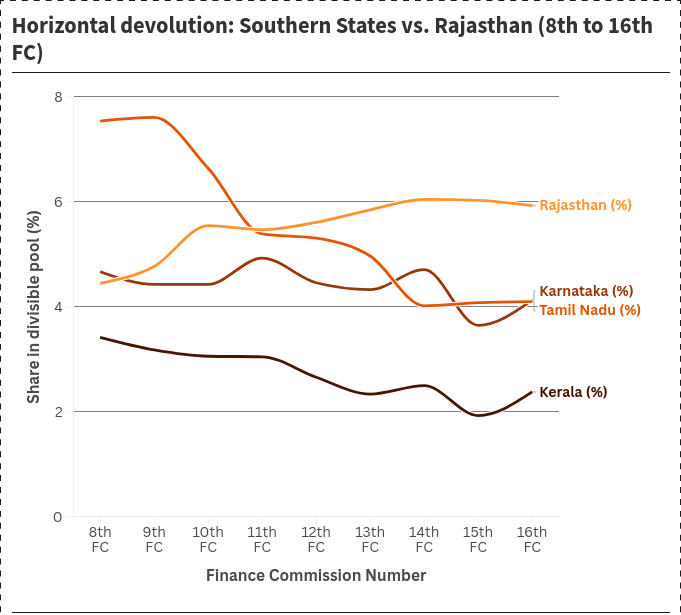 Consider Kerala, Karnataka, Tamil Nadu, and Rajasthan. These States retained their boundaries for 40 years and lend themselves to an apple-to-apple comparison. The steep increase in Rajasthan’s allocation and subsequent stabilisation over the last decade, in contrast to the steep decline and stabilisation for the other States, is the story of India’s devolution dynamics. The table and chart below show how Tamil Nadu, which had 7.54 per cent in the 8th Finance Commission, dropped down to 4.1 per cent in the 16th Finance Commission, while Rajasthan went up from 4.45 per cent to 5.93 per cent in the same period.