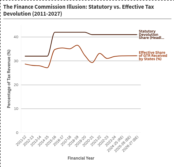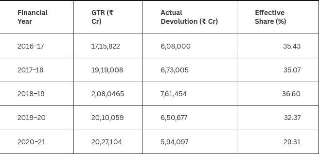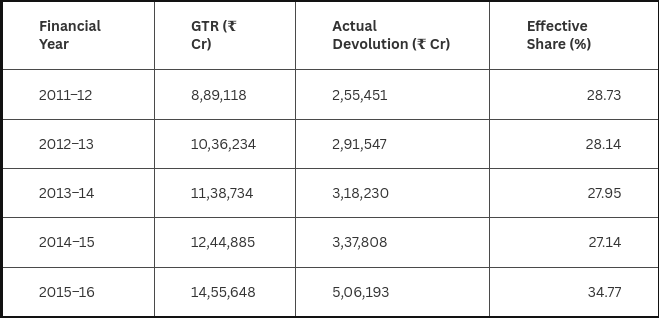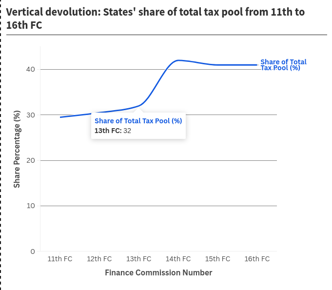 However, there exists a greater problem—one that precedes the horizontal devolution’s allocation ratio: vertical devolution. The FCR’s most important task is to allocate the tax revenues that accrue to the Consolidated Fund of India (CFI) to various governments. Therefore, the FCR’s first step is to decide the amount the Union government shares with the States. Or devolves vertically. The horizontal devolution of the previous section acts on this already devolved money. How much that pot of money contains is what determines how much the States eventually get. Over the past decade, this pot has been seeing some strange pulls in opposite directions.