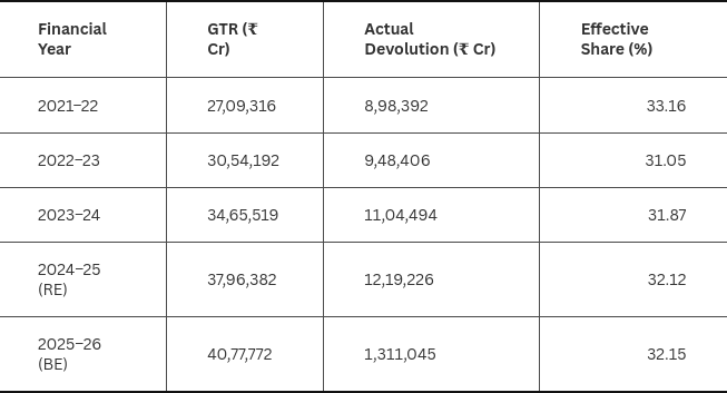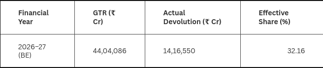 The Union government’s response to this increase has been Machiavellian. It almost doubled the collection of cesses and surcharges as a ratio of its overall collections, knowing they are outside the purview of vertical devolution. In 2010-11, the effective share of gross tax revenues, which includes cess and surcharges, devolved to States was 28.73 per cent; in 2026-27, the Budget estimate is 32.16 per cent (this is shown in the tables below). That is, the Union has managed to change the name under which it collects monies to eschew a 10 per cent increased sharing burden and brought it down to about 4 per cent.