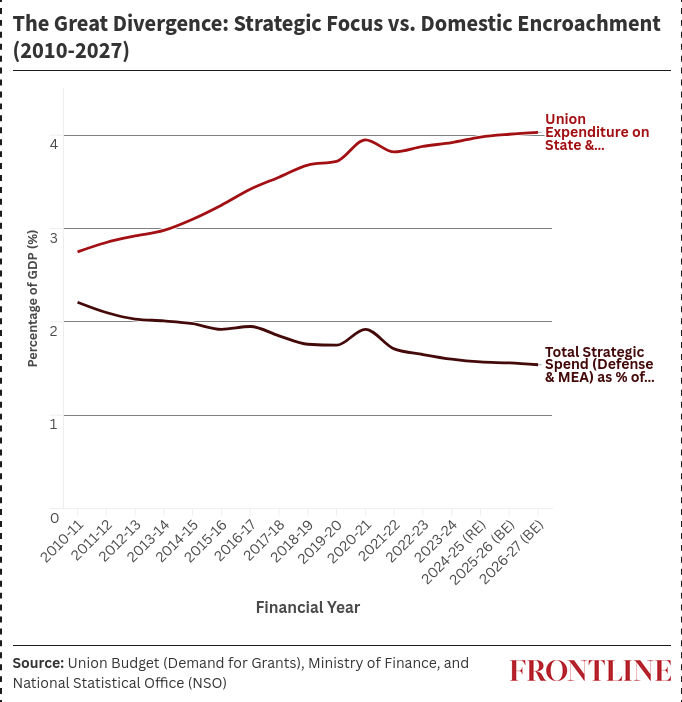 And it’s not as if the Union government is shrinking its defence spending as a ratio of GDP because it’s starved of funds. A look at its spending on State subjects and concurrent list items, areas it has little reason to spend on in the first place, in comparison to defence and external affairs, makes it obvious. The Union government is spending money that ideally should be sent to the States, on State subjects that State governments ought to be spending on. And this is at the expense of defence spending, which the Centre uses as a fig leaf to seek even more funds for itself! And worse, this gap, between where it ought not be spending and where it ought to be, is widening at a rapid pace, as shown in the chart below.