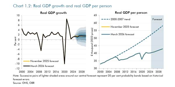 Meanwhile the UK economy has floundered. Real GDP growth in 2025 was just 1.3% (below the forecast at the beginning of that year) and in the last quarter of 2025, that rate fell to just 0.1% yoy. The forecast for this year by the Office for Budget Responsibility (OBR) is for real GDP growth of just 1.1%, reduced from a forecast of 1.4% only six months ago.
