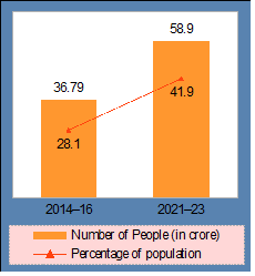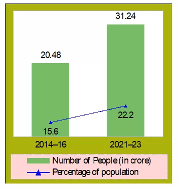 - The proportion of the population that is severely food insecure in the country has risen by nearly 50 percent over this period, from 20.5 crore (15.6 percent of the population) in 2014–16 to 31.2 crore (22.2 percent of population) in 2021–23 (Chart 3.3).