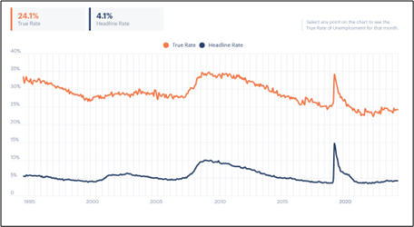 Calculating its “True Rate of Unemployment” back to 1995, the Ludwig Institute finds that unemployment has never been lower than 22 percent and reached a peak of 34.8 percent in February 2010, when the world’s economy was still struggling in the wake of the 2008 economic collapse. The closest the official rate and the true rate were was in April 2020, when the Covid-19 pandemic caused an economic shutdown; that month, the official U.S. rate was 14.2 percent and the Ludwig true rate was 34.2 percent.