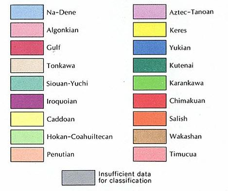 Reconstructed map of the geographical areas where the various Native American languages were spoken in the United States.