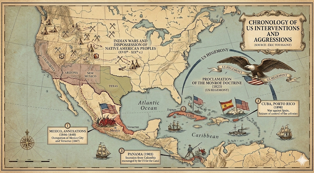 A historical examination of the wars waged on the territory of the United States and in the Western Hemisphere reveals a fundamental continuity. Violence is not an anomaly in American history: it is its matrix. From the destruction of Native American nations to ongoing interference in Latin America and the Caribbean, the same logic has been repeated over the centuries.