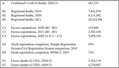 We thus arrive at a plausible estimate of around 4.3 million excess deaths during 2020-21, using official death registrations and estimates of pre-pandemic registration completion from the NFHS. The data and calculations underlying this and the other estimates above are in Table 1.