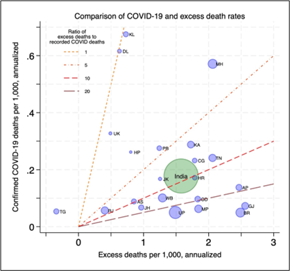 Note: States and union territories with a population above five million in 2019 are depicted in the figure. National estimates for India incorporate data from all states and union territories. All estimates are annualised, representing mean excess deaths or Covid-19 deaths per 1,000 per year for the 2020-21 pandemic period. Excess deaths are calculated by adjusting excess registrations with state-specific death registration completion estimates in the NFHS in 2019. State codes correspond to assigned regional transport office codes for vehicle registration.